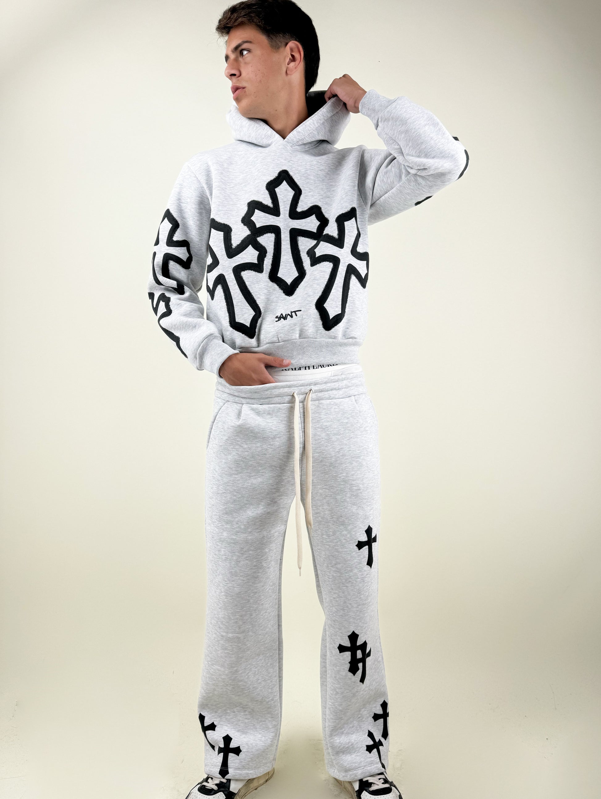 Comfort e stile si incontrano in questo completo tuta grigio chiaro in cotone, decorato con maxi croci nere in contrasto per un look deciso e contemporaneo. La felpa con cappuccio e tasca frontale dona un tocco urban, mentre i pantaloni con coulisse regolabile garantiscono una vestibilità rilassata.
