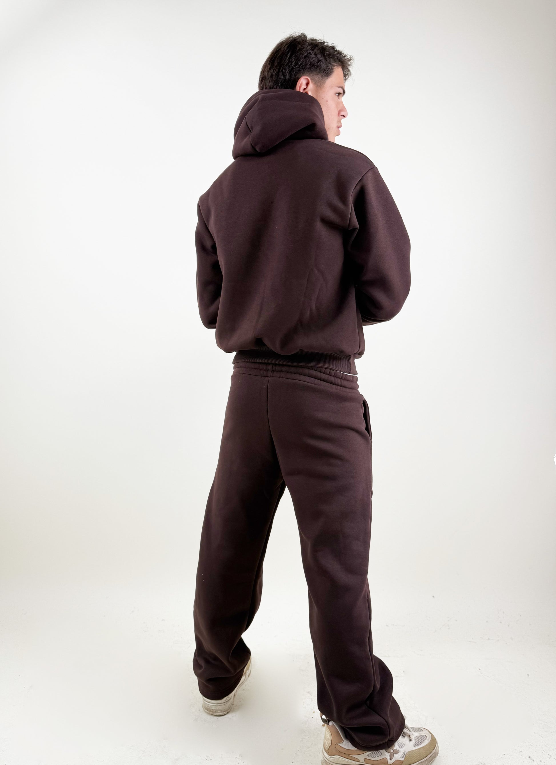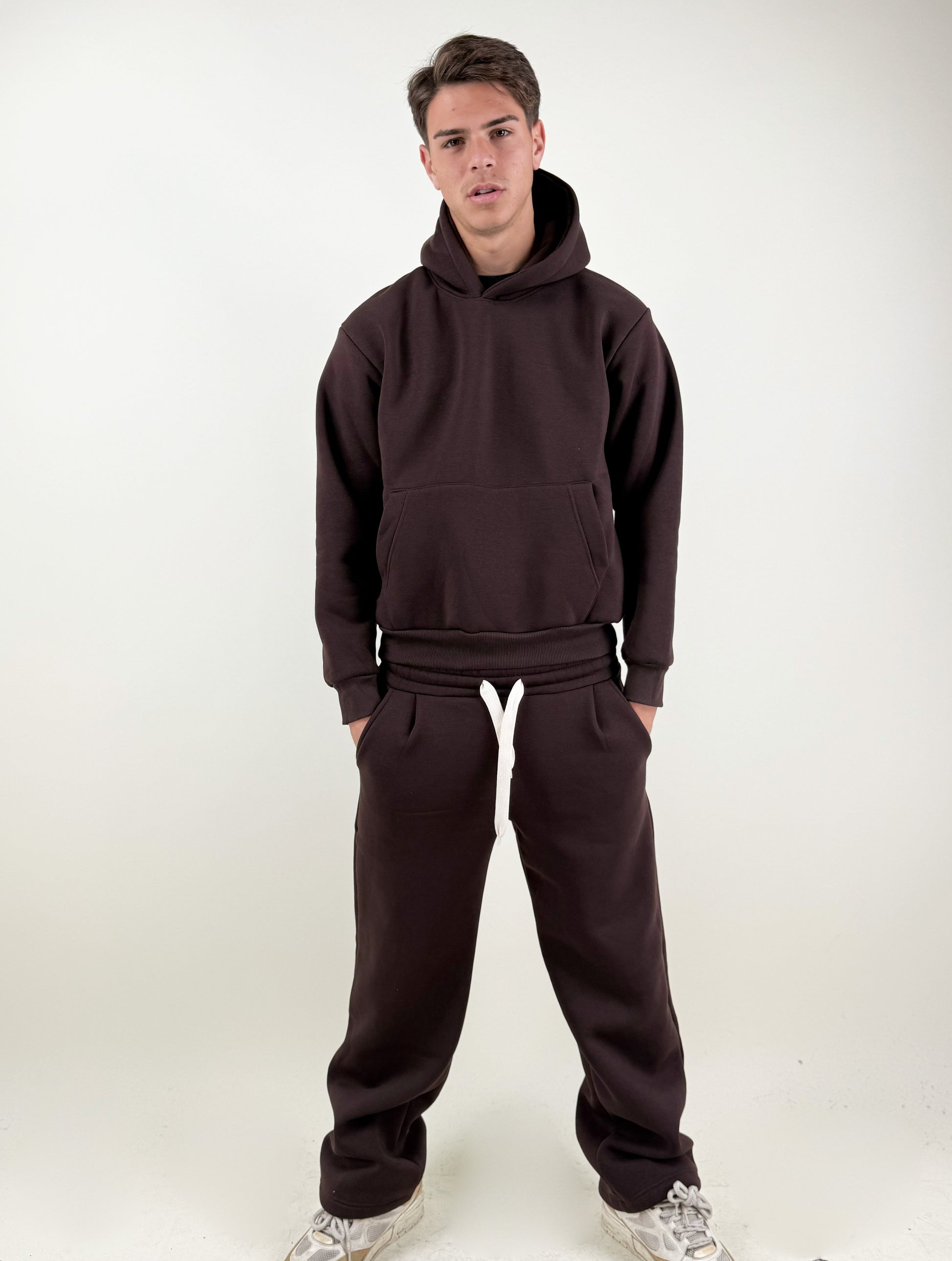Il completo include una felpa marrone con cappuccio e tasca a marsupio e pantaloni coordinati con coulisse regolabile, realizzati in tessuto morbido e confortevole.