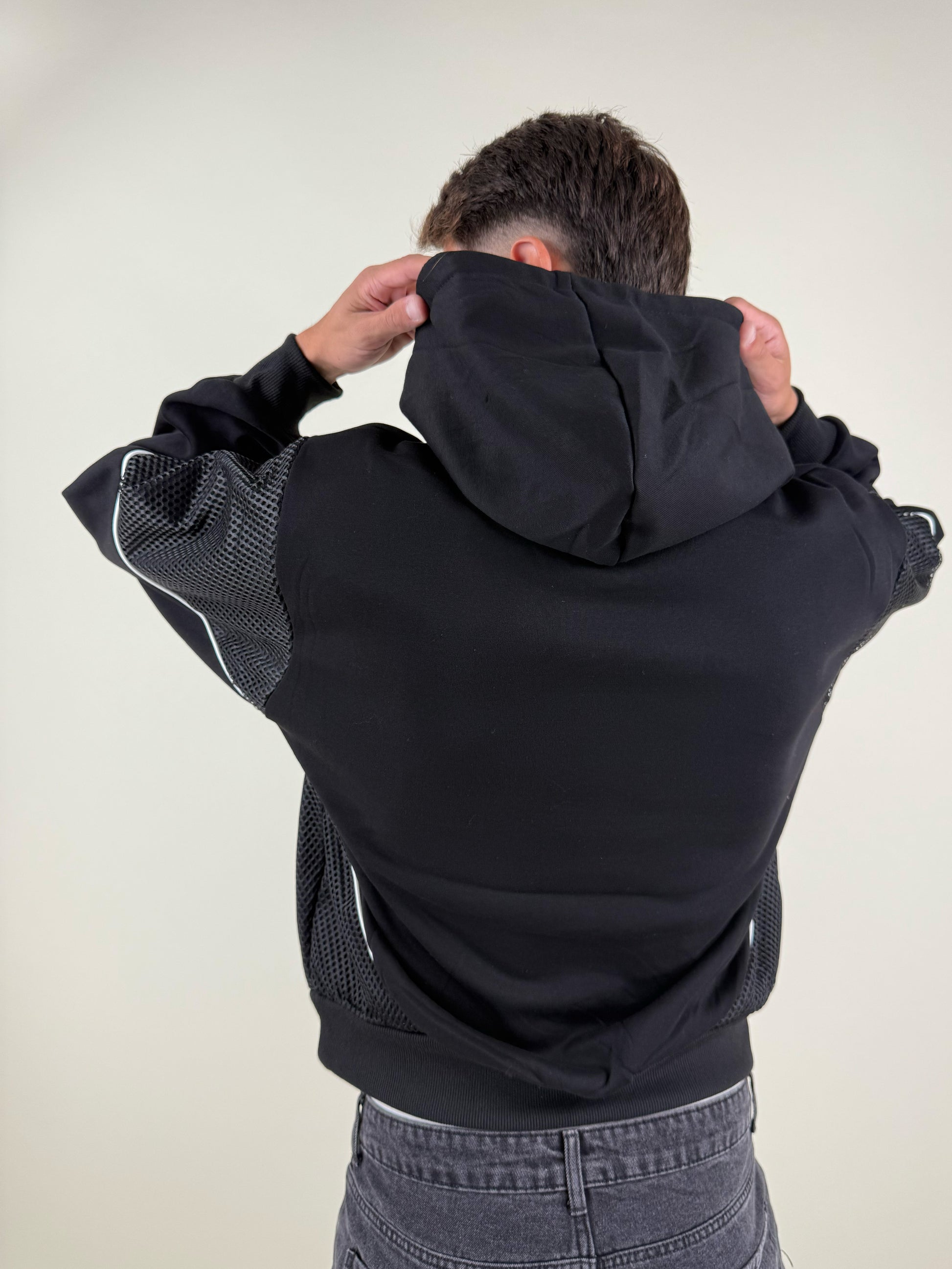 Il design presenta una stampa gotica frontale “Scandal 89” di grande impatto visivo, coulisse bianche extra-long e inserti in mesh sportiva sulle maniche per un tocco tecnico e dinamico.