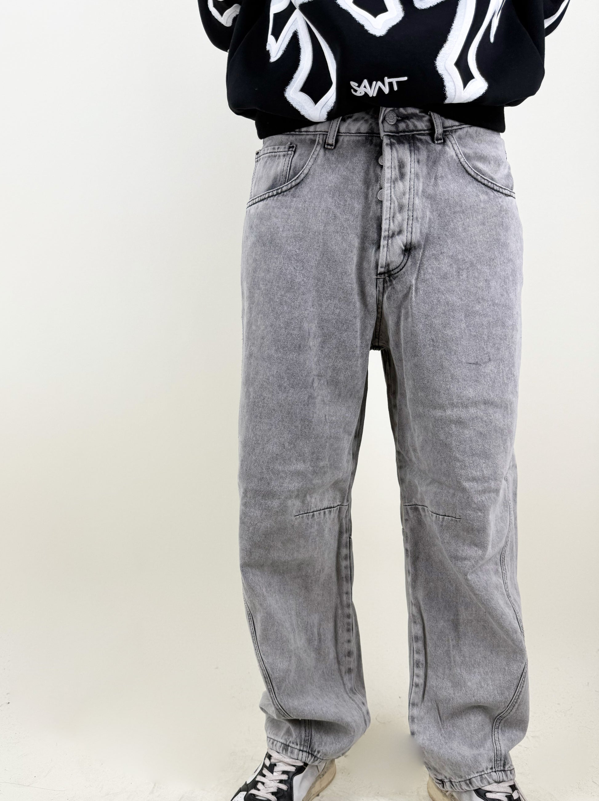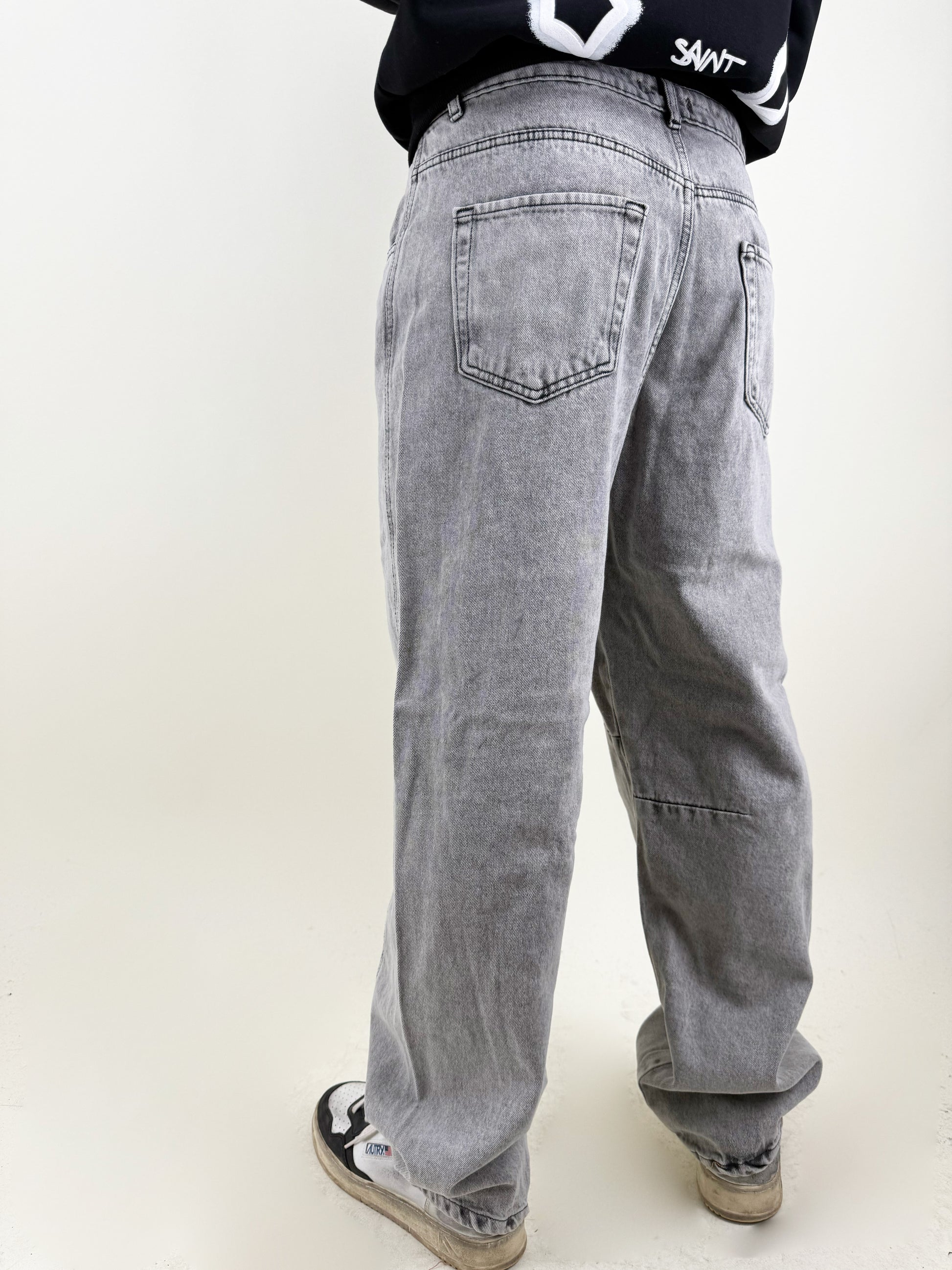 Jeans grigi in denim effetto washed, dallo stile baggy e rilassato. Realizzati in cotone morbido ma strutturato, offrono una vestibilità ampia e moderna, perfetta per outfit streetwear contemporanei. I dettagli sfumati e le cuciture visibili donano un look autentico e urban.
