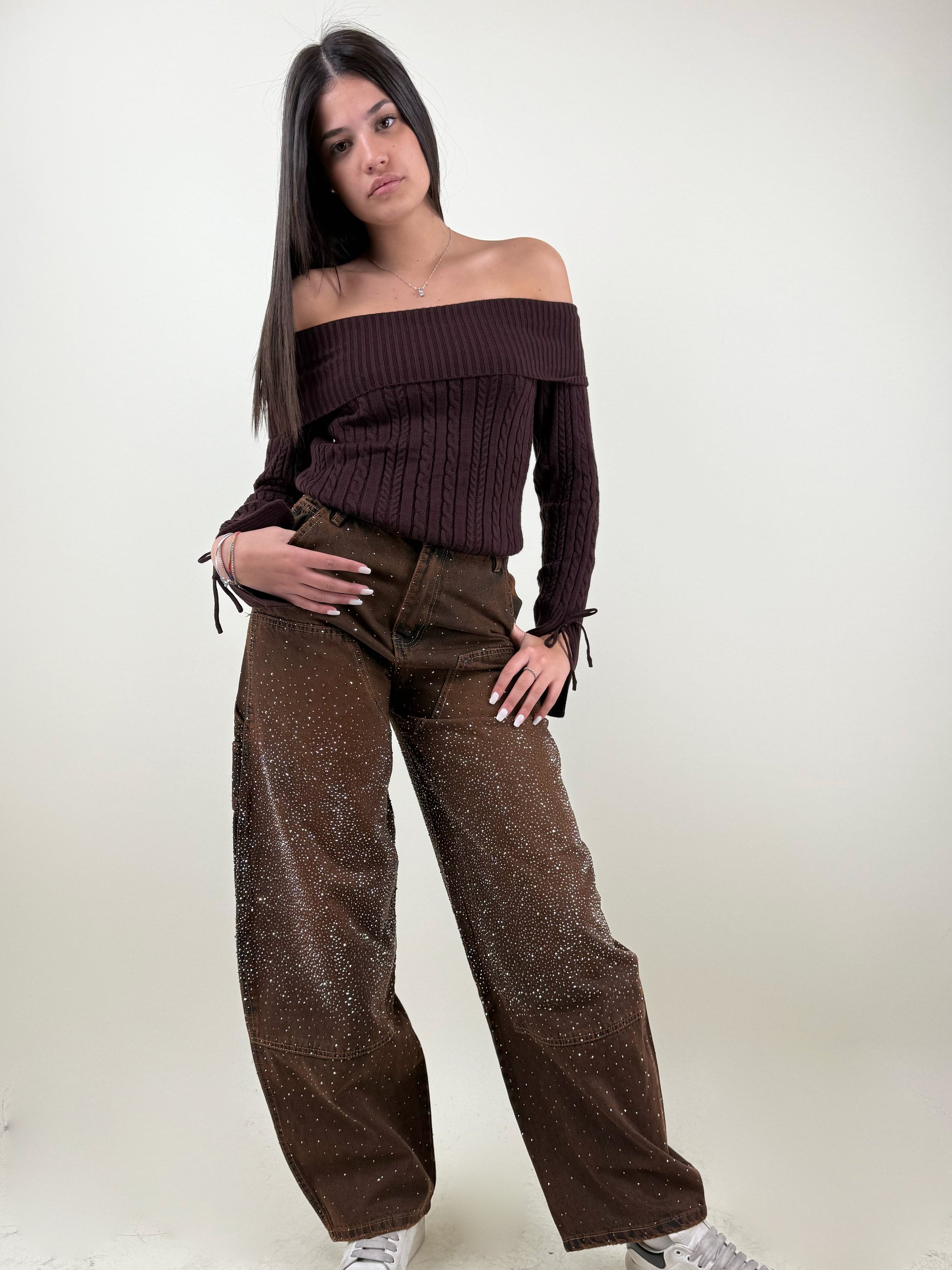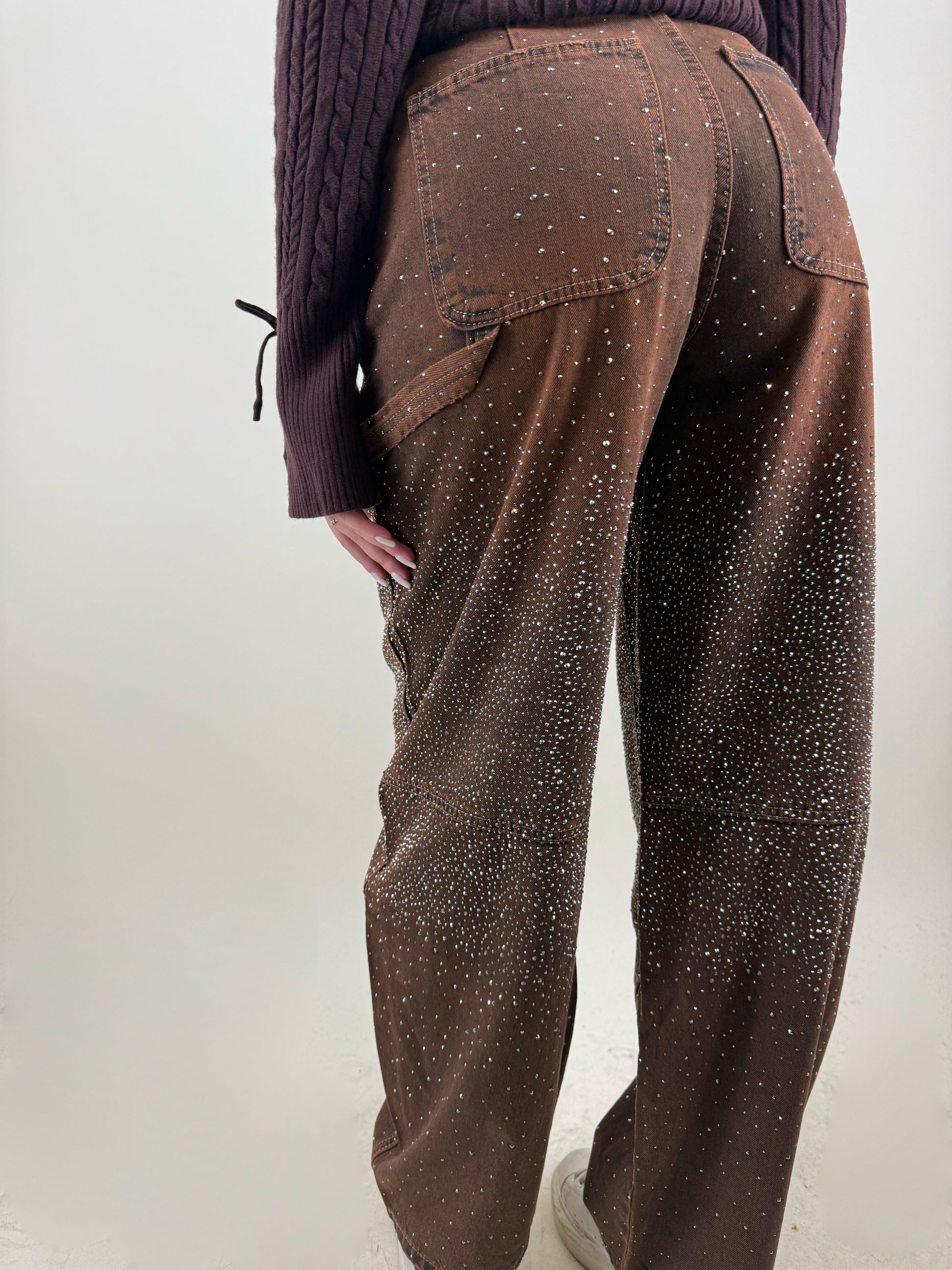 Esprimi la tua personalità con questi esclusivi pantaloni marroni oversize tempestati di micro strass luminosi. Realizzati in tessuto denim morbido e resistente, combinano comfort e stile in un look contemporaneo e scintillante. Perfetti per chi ama distinguersi, questi jeans a gamba larga donano un tocco glamour e streetwear a ogni outfit — ideali con sneakers bianche o stivaletti per un effetto chic e casual.