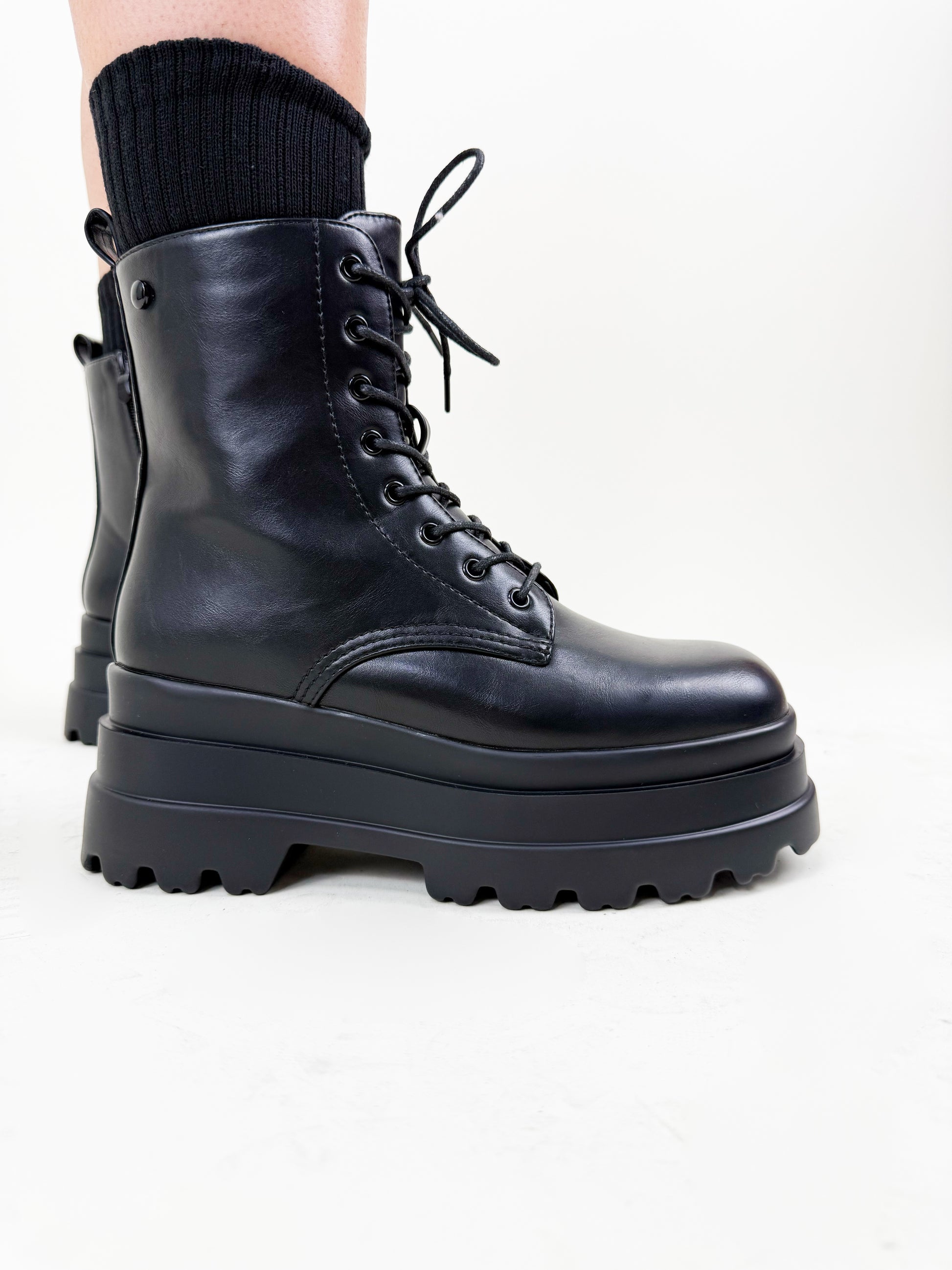 Aggiungi grinta al tuo stile con i Combat Boots Platform in Ecopelle Nera – Power Step, gli stivali must-have della stagione.