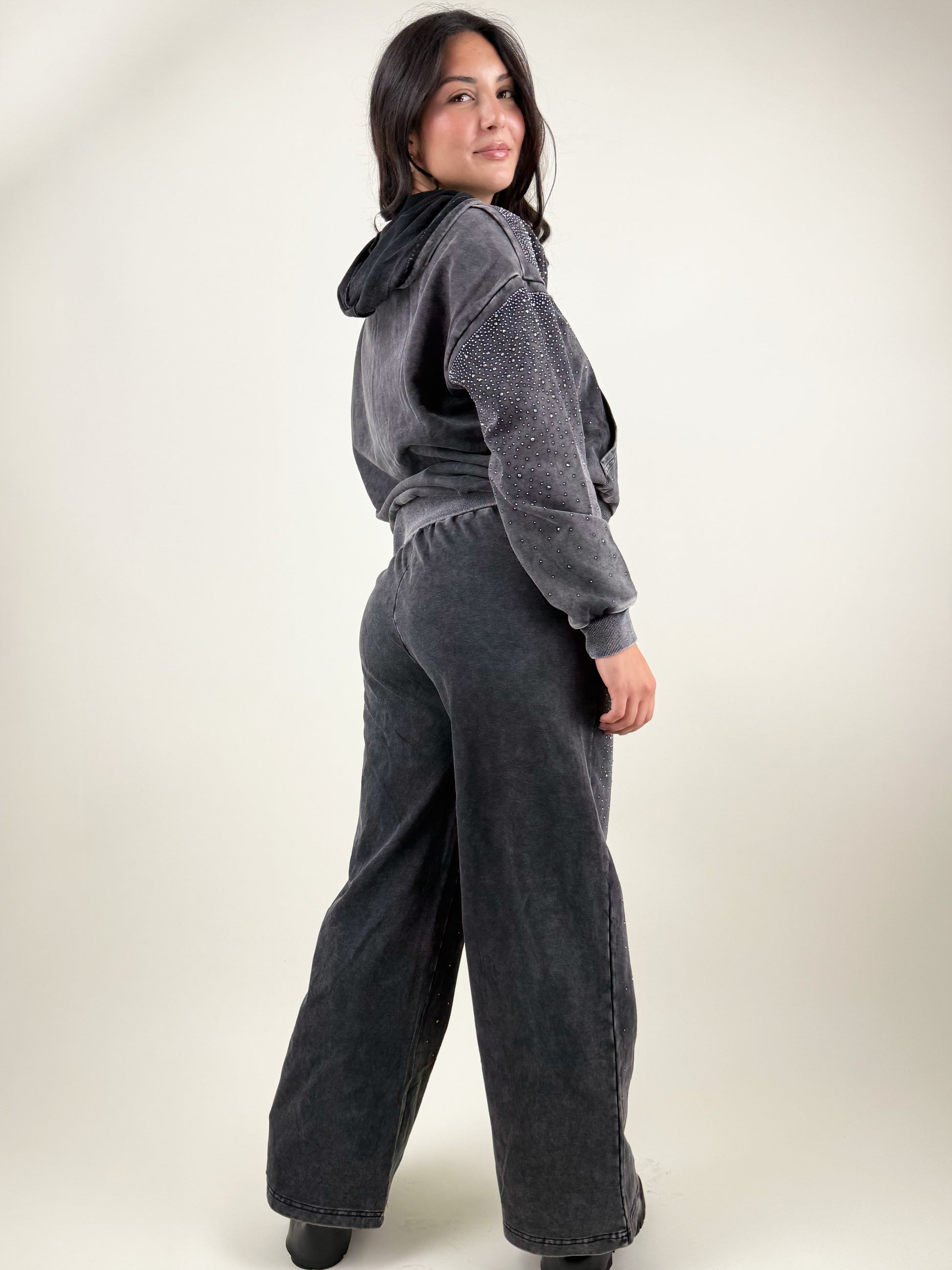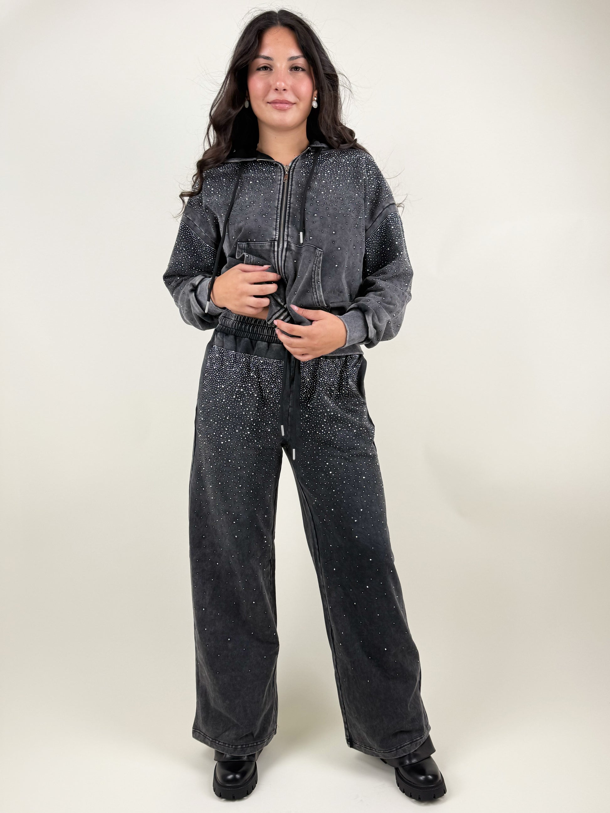 • Pantaloni ampi e comodi con elastico in vita e applicazioni di strass che donano un look unico e scintillante.