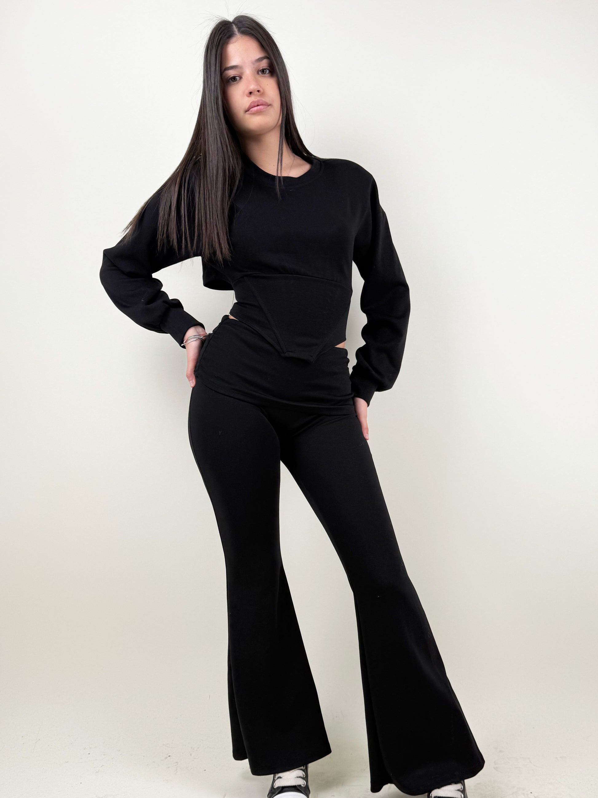 Il top cropped presenta una schiena con lacci effetto corsetto, che aggiunge un tocco sofisticato e femminile, mentre i pantaloni svasati a vita alta slanciano la figura, garantendo comfort e vestibilità perfetta.