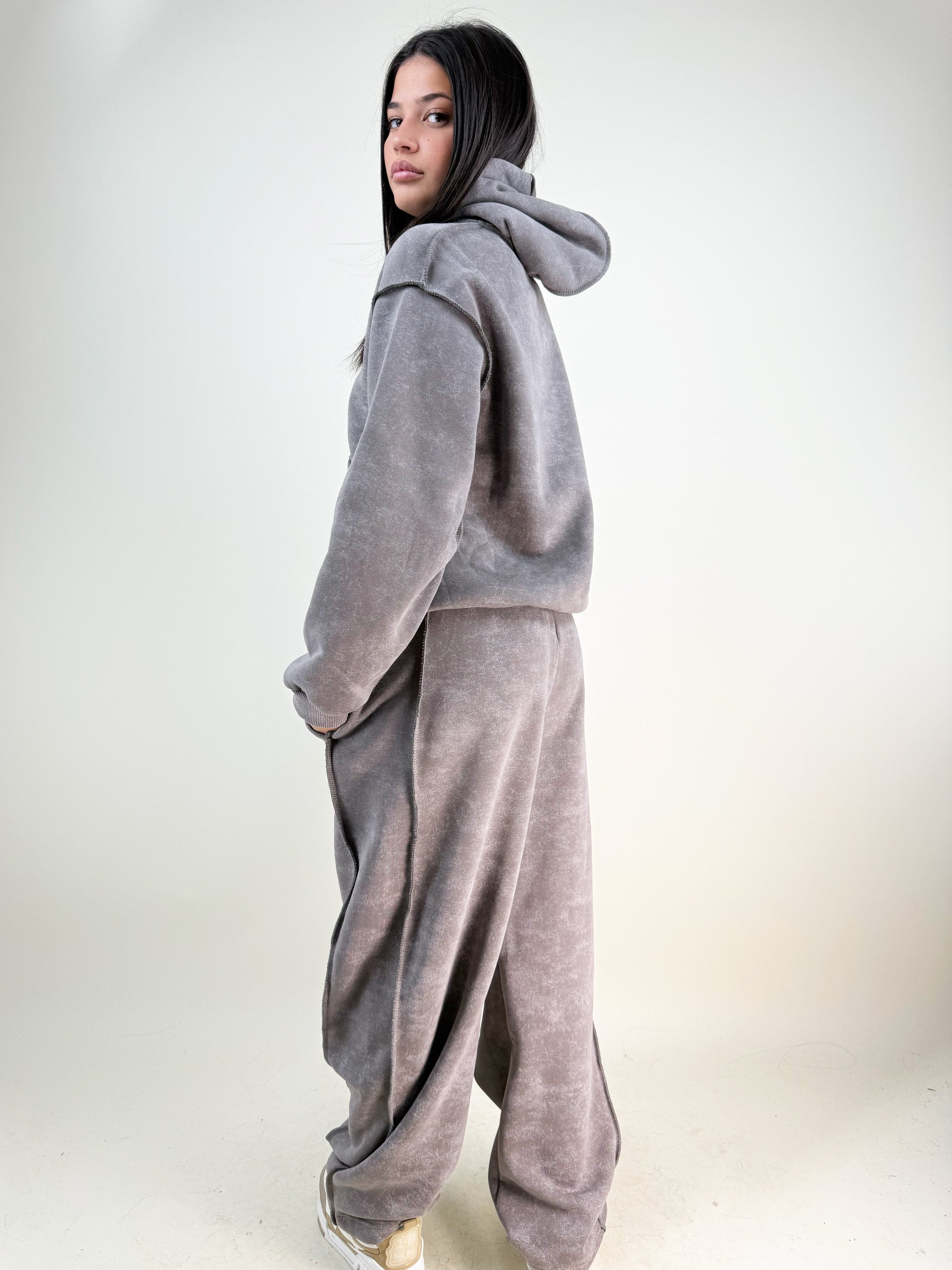 • Design: felpa con cappuccio oversize e pantalone a gamba larga, coulisse regolabile in vita.