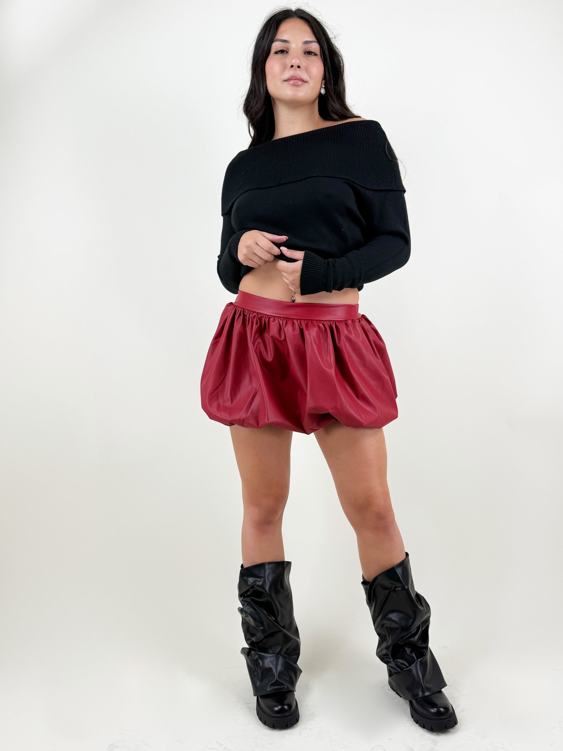 Distinguiti con la Gonna Balloon in Ecopelle Rossa – Bold Chic, un capo iconico che unisce carattere e femminilità. Realizzata in morbida ecopelle di alta qualità, questa gonna ha una particolare linea a palloncino che valorizza la silhouette e dona movimento al look.
