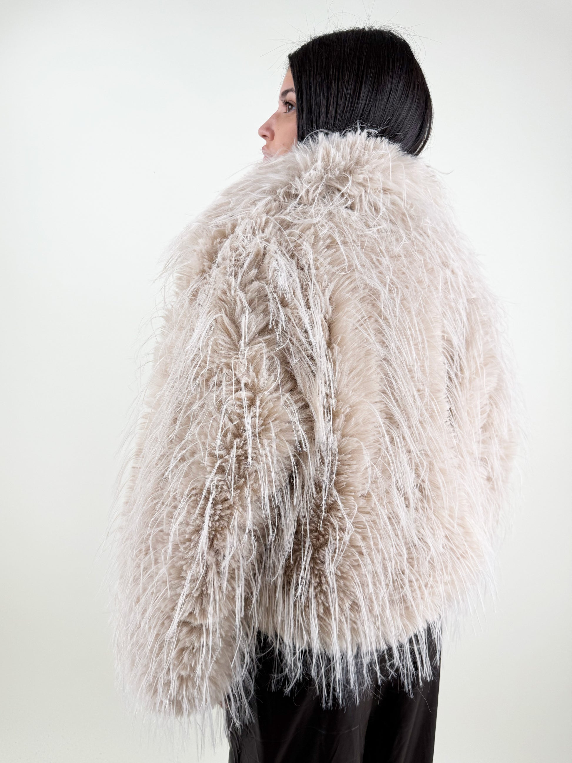 Realizzata in pelliccia ecologica a pelo lungo, unisce stile luxury e rispetto per l’ambiente, donando calore e morbidezza in ogni occasione.